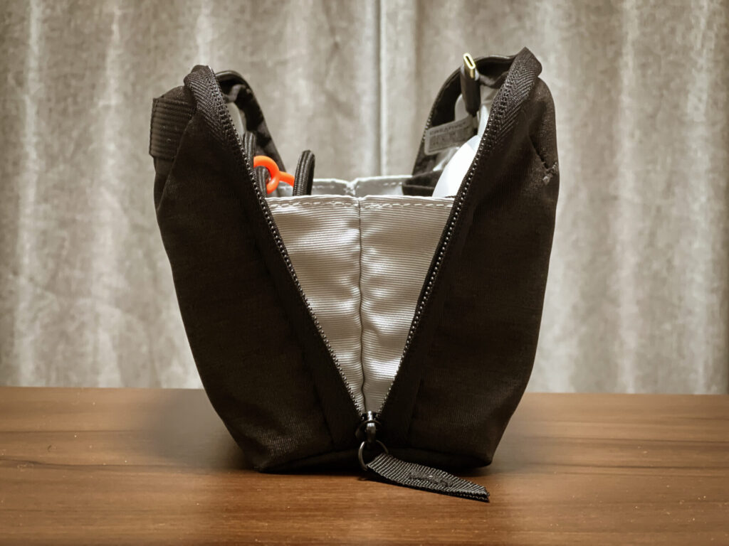 これが本当に便利で、カフェの狭いテーブルでもポーチが場所を取らず、どこに何があるか一目でわかります。